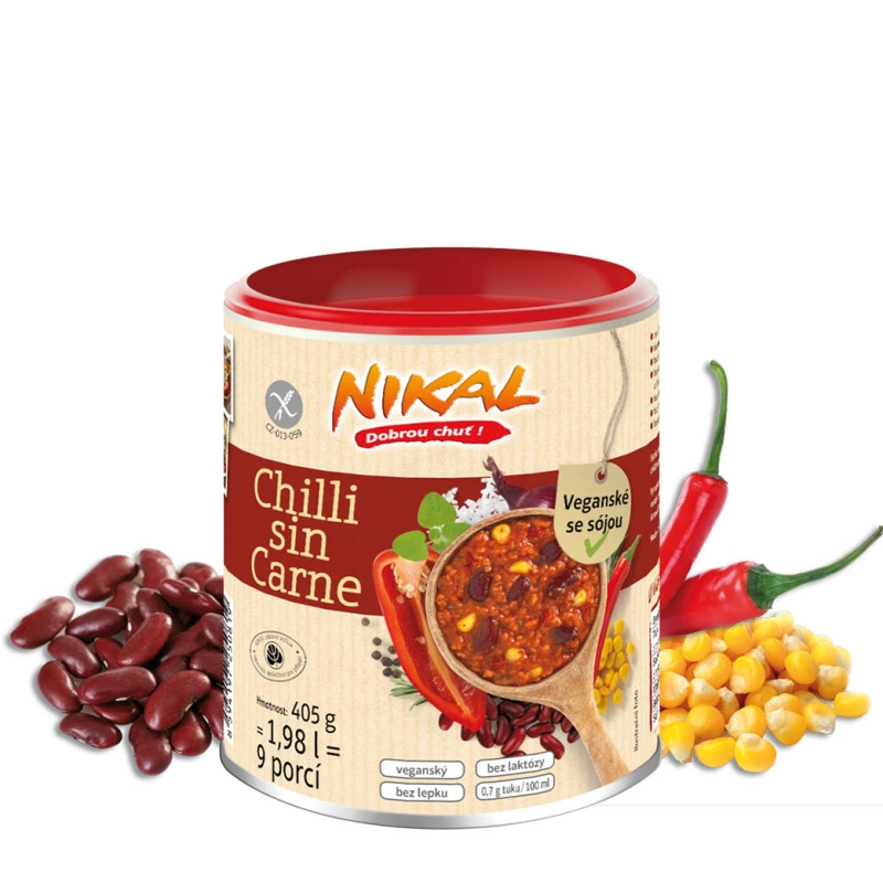 Sója, dostatok červených fazúľ, slnkom rozmaznávaná kukurica, paradajky, paprika, cibuľa, chilli, pikantné bylinky a korenie robia z NIKAL Chilli sin Carne ohnivý Eintopf (hustú polievku). Je bez mäsa a chutí skvelo. Vychutnajte si vegánske Chilli ako samostatný pokrm, ku ktorému sa úplne štýlovo hodí chrumkavé nachos alebo skombinujte túto texasko - mexickú klasiku s ryžou, zeleninou či zemiakmi. Ohnivé NIKAL Chilli sin Carne je perfektné ako náplň do tortill, burritos, enchiladas a wrapov.