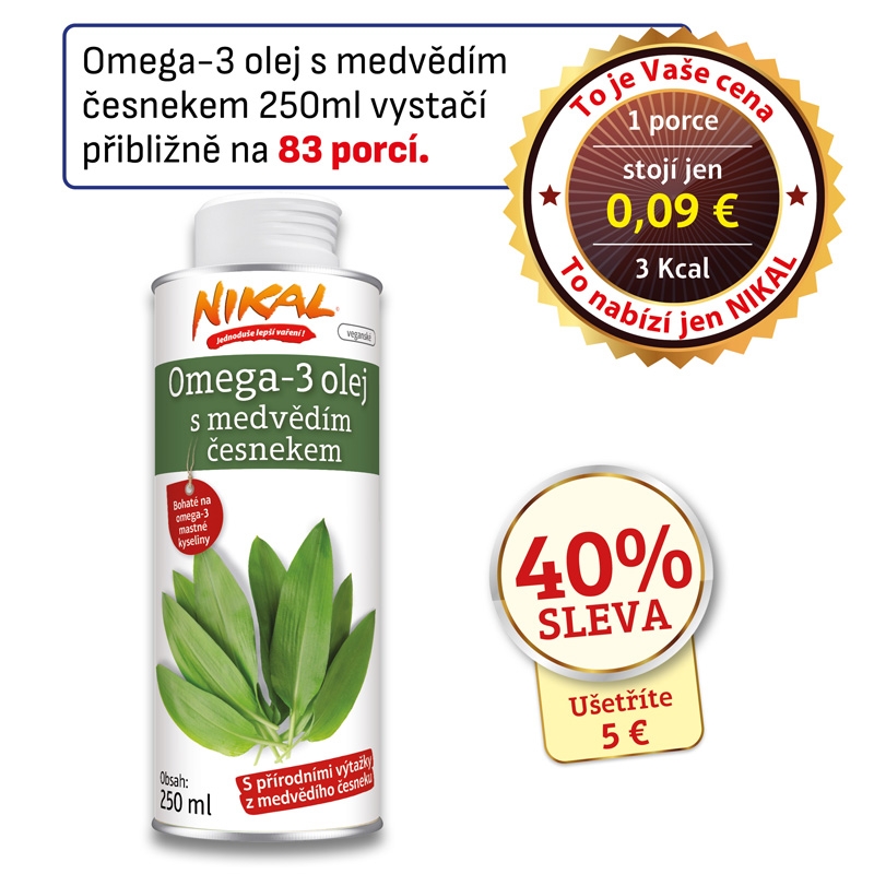 NIKAL Omega-3 olej s medvědím česnekem obsahuje 6,7 g kyseliny alfa-linolenové na 100 ml.