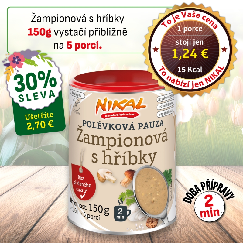 Když je venku pošmourno a den se zdá delší než obvykle, je čas na něco, co zahřeje a zvedne náladu. Polévková pauza - Žampionová s hříbky je přesně to pravé. Hřejivá, jemná a plná poctivé houbové chuti potěší v každém okamžiku. Stačí zalít horkou vodou, promíchat a za dvě minuty máte v hrnku porci útulné pohody. Ideální pro chladné večery, rušné dny v práci i malé přestávky mezi povinnostmi.