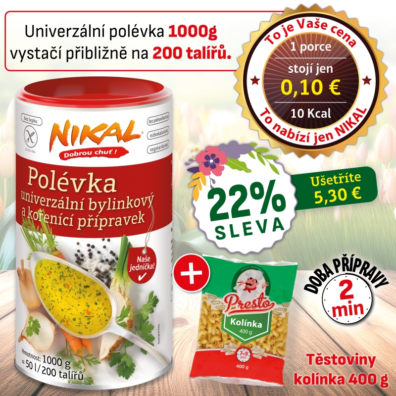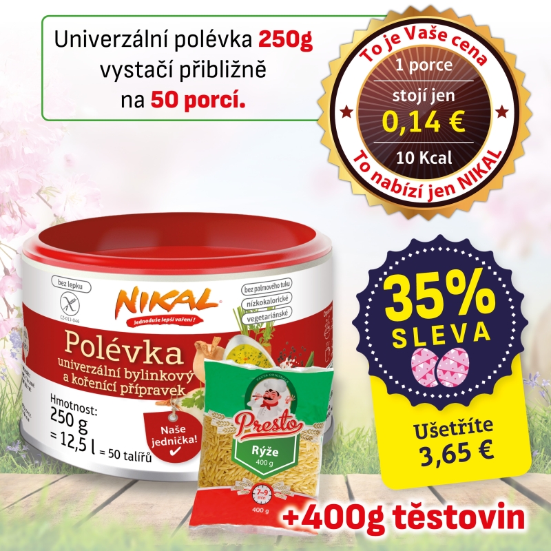 Hlavní přednost: NIKAL Polévka podtrhuje přirozenou vlastní chuť Vašich pokrmů, aniž by ji potlačila. Snadno se sype, ihned se rozpouští ve studené i teplé vodě. Ideální i jako chutný čirý vývar na svačinku nebo jako polévkový nápoj.