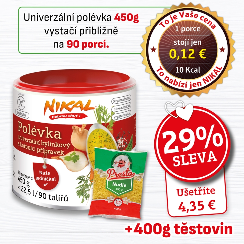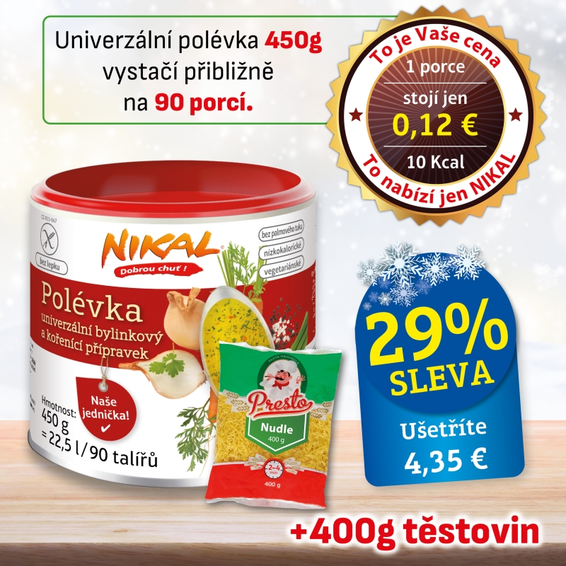 Hlavní přednost: NIKAL Polévka podtrhuje přirozenou vlastní chuť Vašich pokrmů, aniž by ji potlačila. Snadno se sype, ihned se rozpouští ve studené i teplé vodě. Ideální i jako chutný čirý vývar na svačinku nebo jako polévkový nápoj.