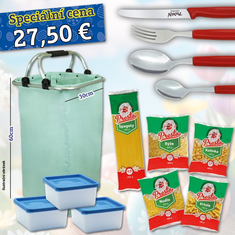 Využijte velikonoční období k praktickému doplnění domácnosti. Velikonoční sada je promyšleně sestavený set užitečných pomocníků a oblíbených těstovin pro každodenní vaření. Spojuje kvalitu, praktičnost a výraznou úsporu v jednom balení.