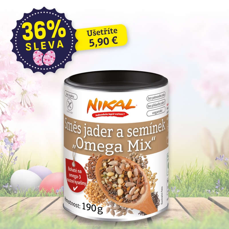 NIKAL Směs jader a semínek Omega-Mix je bez přidaného cukru,* ale obsahuje přirozeně se vyskytující cukr, který je uveden i v nutriční tabulce.