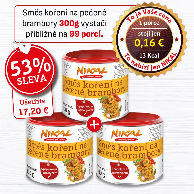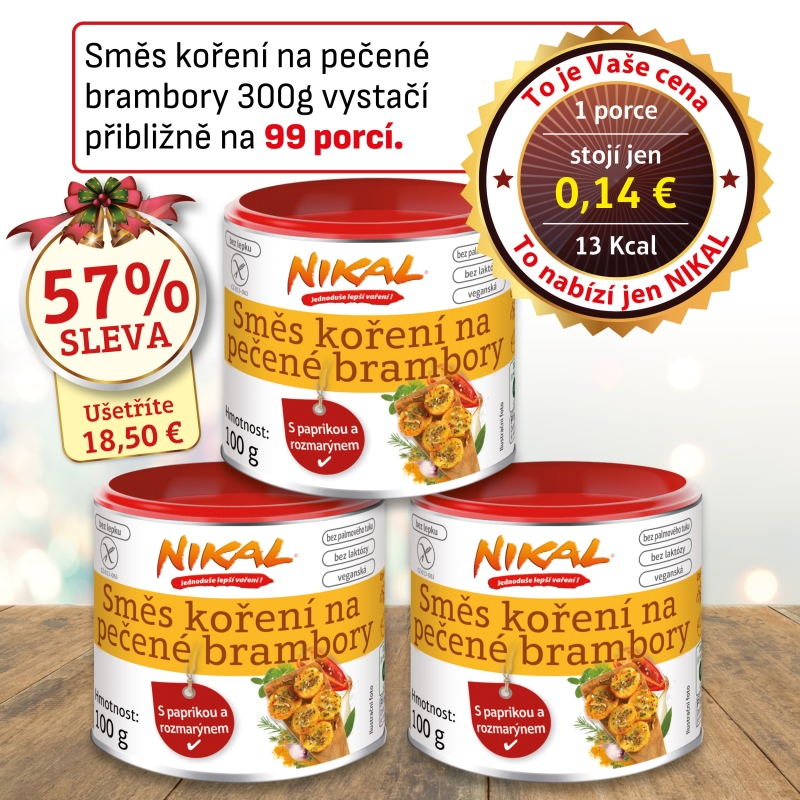 Nová zmes korenia na pečené zemiaky NIKAL kombinuje širokú škálu bylinných a koreňových vôní a vytvára skutočnú chuťovú explóziu. Čerstvé aromatické bylinky, ako je tymian, rozmarín a bazalka, sú v kombinácii s petržlenovou vňaťou, cesnakom, čiernym a zeleným korením, paprikou, paradajkami, koriandrom, majoránom, bobkovým listom a rascou, naozaj výraznou chuťovou rozprávkou.